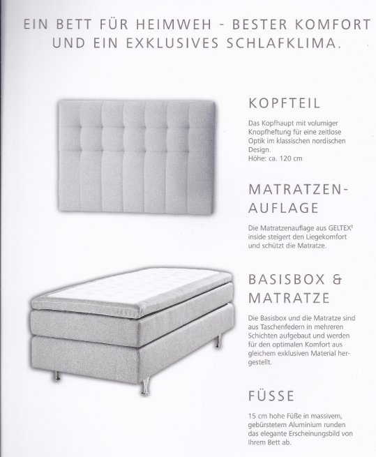 EXCLUSIVES BOXSPRINGBETT AUS DEM HAUSE SEMBELLA, Preis beinhaltet Kopfhaupt, Topper, Matratze, Box und Füße, nur in abgebildeter Ausführung lieferbar in den Größen: 90x200cm, 140x200cm, 160x200cm und 180x200cm, AUFBAU: Kopfteil mit volumiger Knopfheftung, ca.120cm hoch, Topper(Auflage) aus GELTEX-inside für den gesteigerten Liegekomfort, Basisbox und Matratze sind aus Taschfederkern in mehreren Schichten aufgebaut und werden aus gleichem exclusivem Material hergestellt, 15cm hohe Füsse aus gebürstetem Aluminium runden das elegante Erscheinungsbild ab, Stoff grau wie abgebildet