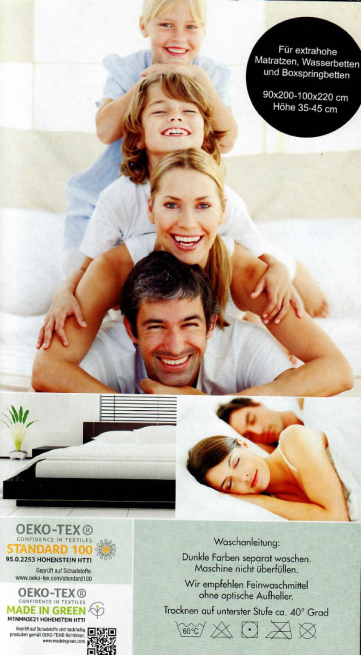 Artikelgruppe: LEINTÜCHERArtikel-Nr.: 800135DAS BOXSPRING DELUXE Jerseyspannleintuch, aus ausgesuchten und geprüften Materialien hergestellt, 95% Makobaumwolle, supergekämmt, 5% Elasthan, ca. 230gr/m², weiß, das perfekte Leintuch für extrahohe Matratzen, Wasserbetten und Boxspringbetten, 90x200cm - 100x220cm , bis 45cm Matratzenhöhe, hochwertige Verarbeitung Made in Europe, Made in Greeen, OekoTex 100 schadstoffrei geprüftSTATT 71,88 €